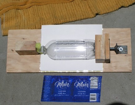 I used some scraps on a board--a block with some foam to hold the mouth of the bottle, and a screw through a piece of angle iron with a taped hole on the other end. I used blocks of various sizes between the screw and the bottom of the bottle, 1) so the screw wouldn't cut into the bottle and 2) so I could used different blocks for different lengths (heights) of bottles. This held the bottle a lot more securely--enough to easily take the profile without it moving. I taped the paper down this time instead of using push pins. Bricks were used to prop up the fixture so it could be adjusted perpendicular to the sun and this was done on concrete. The blanket in the picture was because this was done in the summer and the concrete was both hot and hard on bare knees (while wearing short pants). This time the fixture and process worked very well and profiles were obtained for all my bottles.; Note the label was properly removed this time for all profiles.