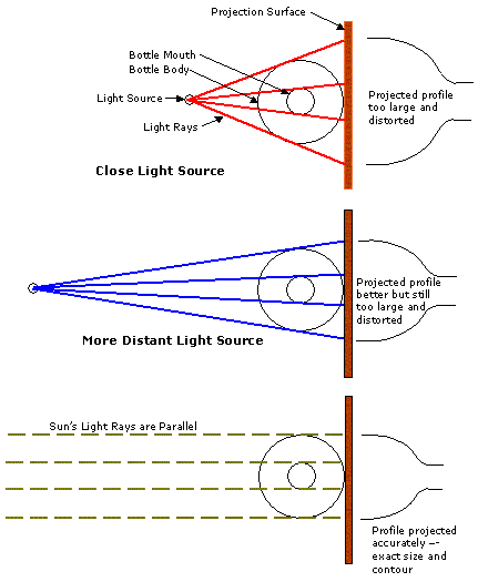So the best way is to set the bottle on a board with a paper attached to the board, align the board so it is exactly perpendicular to the sun's rays, and then you have a perfect shadow that can be traced. If the board is not perpendicular then the profile will also be distorted.